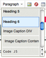 The objects in the above code reference your existing stylesheet, so alter it to display only the styles you want appear in the Styles drop-down menu. As an example, Highlight Yellow is a label that appears when the drop-down menu is clicked from the toolbar. If you highlight text in the editor and select this style, a <span> tag is wrapped around your selection and given a class of highlight. The class highlight refers to the properties in your default stylessheet for that class.